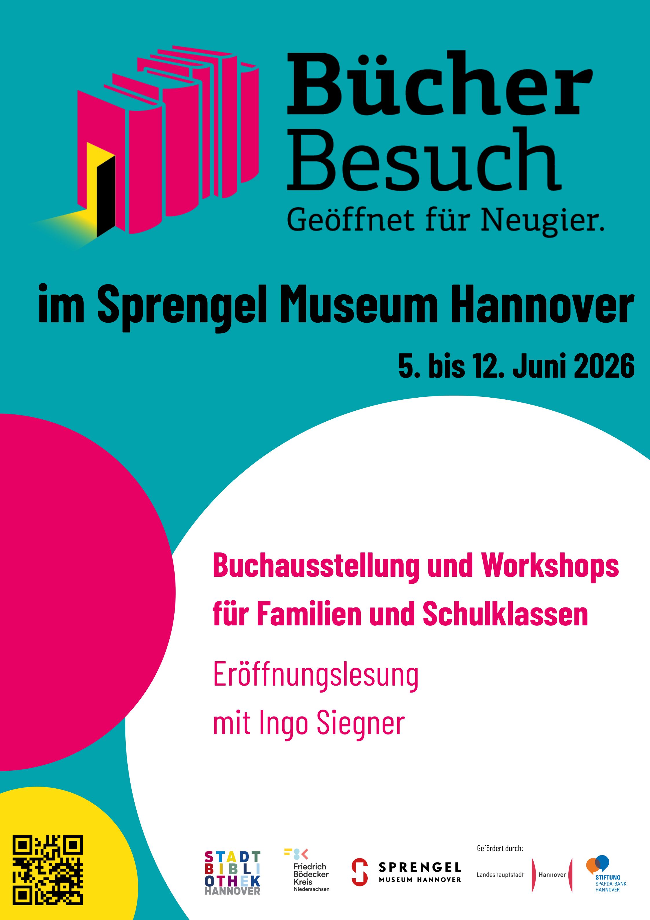 Die Ausstellung hat Tradition: Seit den 1950er-Jahren tourt sie als „Jugendbuchwoche“ durch Hannover. Unter dem neuen Namen „BücherBesuch – Geöffnet für Neugier“ setzt das Format künftig alle zwei Jahre gemeinsam mit wechselnden Kulturinstitutionen neue Akzente. Den Auftakt macht das Sprengel Museum. Begleitet von Einführungen der Stadtbibliothek und Lesungen des Friedrich-Bödecker-Kreis Niedersachsen e.V. reisen die Bücher dann zwei Jahre lang durch mehr als 30 Schulen.